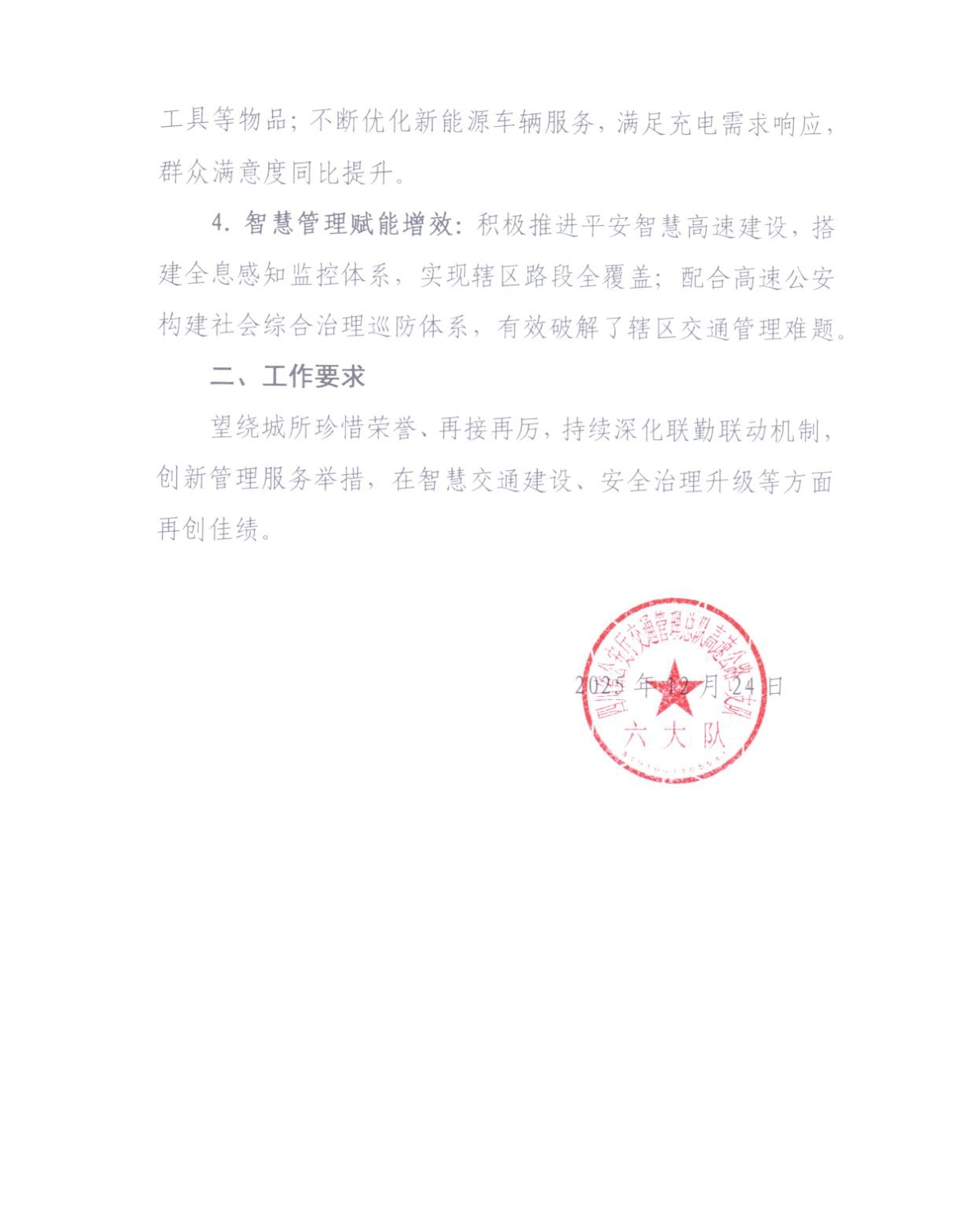 1月15日,高開司收到來(lái)自四川省公安廳交通管理總隊(duì)高速公路二支隊(duì)六大隊(duì)的一封感謝信。信中對(duì)高開司繞城高速2025年度“安全暢通、優(yōu)質(zhì)服務(wù)、智慧升級(jí)”核心目標(biāo),深度踐行“一路三方”聯(lián)勤聯(lián)動(dòng)與“五崗合一”工作機(jī)制,在轄區(qū)高速公路安全防控、保通保暢、服務(wù)提質(zhì)、科技賦能等工作中成效顯著,全年未發(fā)生一般程序道路交通事故,為區(qū)域高速公路管理樹立了先進(jìn)標(biāo)桿,給予高度贊譽(yù),對(duì)公司與高速公安攜手筑牢道路安全防線、全力保障公眾出行順暢的堅(jiān)實(shí)舉措表達(dá)誠(chéng)摯謝意,字里行間滿含認(rèn)可與期許。